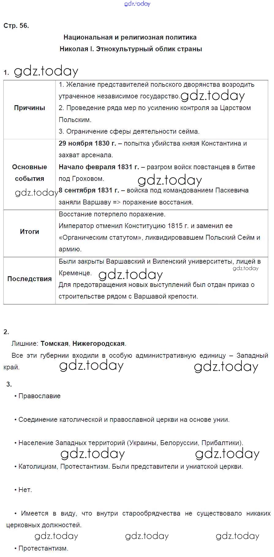 На страницах сайта gdz.today вы найдете учебный и вспомогательный материал, направленный на улучшения знаний школьной программы. ГДЗ - онлайн мир знаний Решение к части 1. Страницы 56 Рабочей тетради по Истории России для 9 класса Данилов, Косулина Просвещение УМК 2017