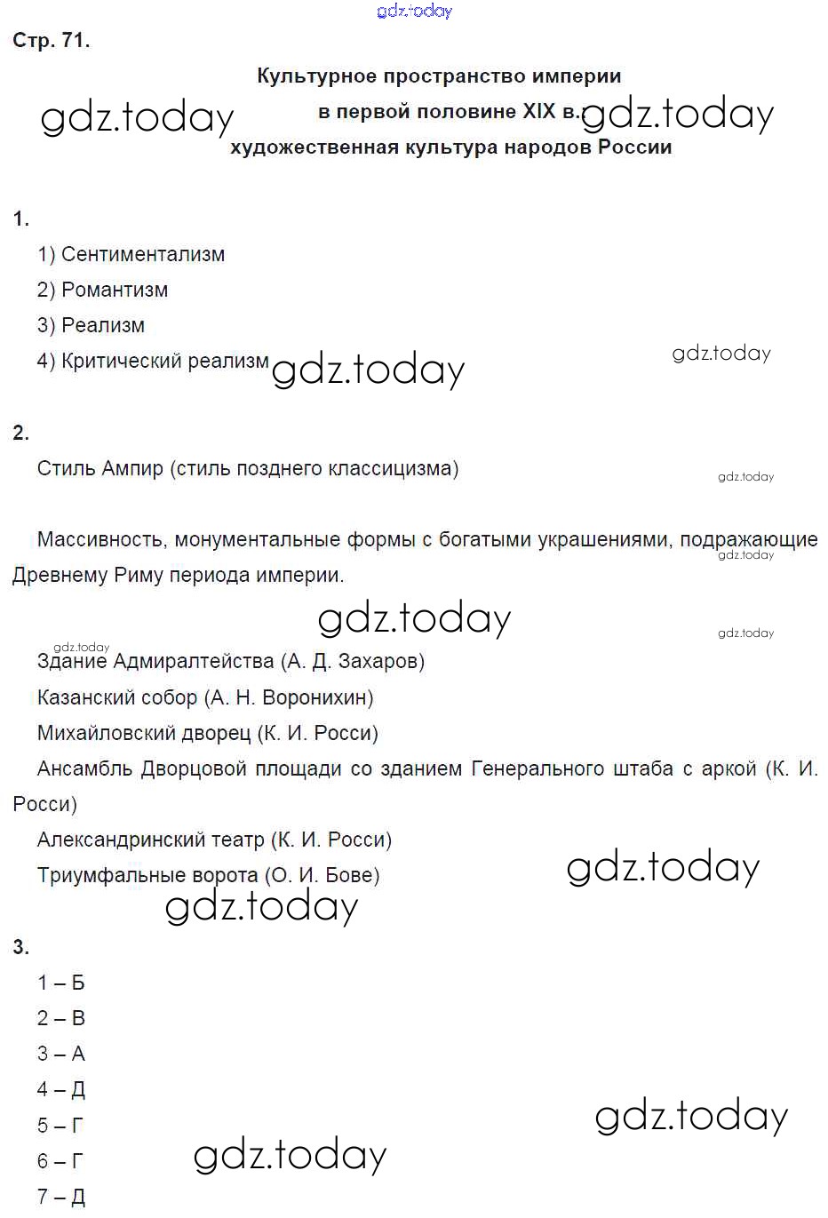 На страницах сайта gdz.today вы найдете учебный и вспомогательный материал, направленный на улучшения знаний школьной программы. ГДЗ - онлайн мир знаний Решение к части 1. Страницы 71 Рабочей тетради по Истории России для 9 класса Данилов, Косулина Просвещение УМК 2017
