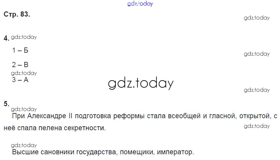 На страницах сайта gdz.today вы найдете учебный и вспомогательный материал, направленный на улучшения знаний школьной программы. ГДЗ - онлайн мир знаний Решение к части 1. Страницы 83 Рабочей тетради по Истории России для 9 класса Данилов, Косулина Просвещение УМК 2017