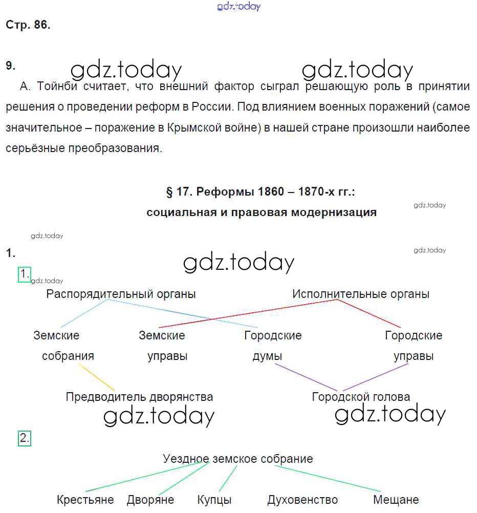 На страницах сайта gdz.today вы найдете учебный и вспомогательный материал, направленный на улучшения знаний школьной программы. ГДЗ - онлайн мир знаний Решение к части 1. Страницы 86 Рабочей тетради по Истории России для 9 класса Данилов, Косулина Просвещение УМК 2017