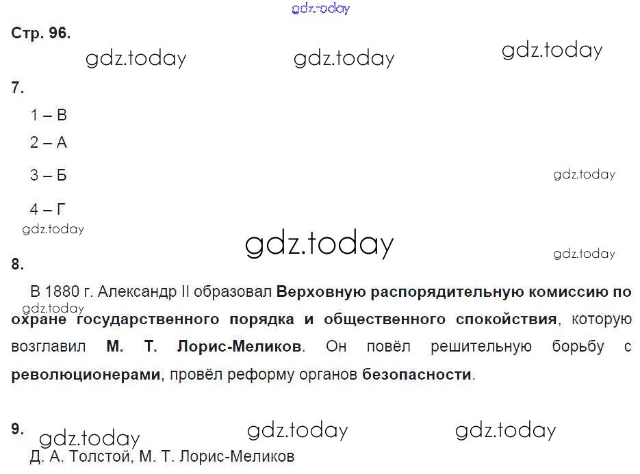 На страницах сайта gdz.today вы найдете учебный и вспомогательный материал, направленный на улучшения знаний школьной программы. ГДЗ - онлайн мир знаний Решение к части 1. Страницы 96 Рабочей тетради по Истории России для 9 класса Данилов, Косулина Просвещение УМК 2017