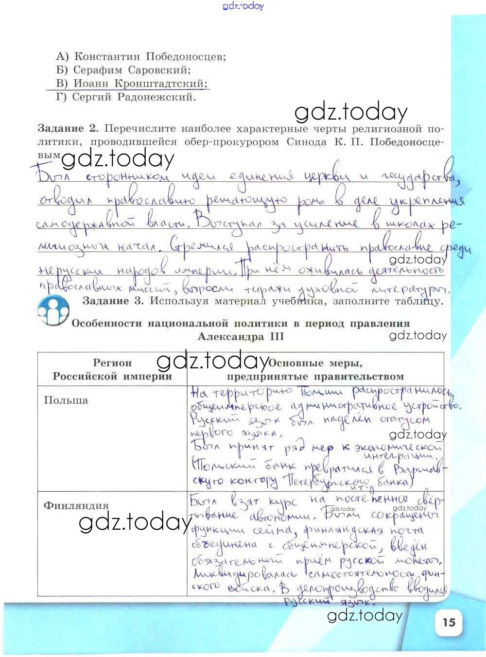 На страницах сайта gdz.today вы найдете учебный и вспомогательный материал, направленный на улучшения знаний школьной программы. ГДЗ - онлайн мир знаний Решение к части 2. Страницы 15 Рабочей тетради по Истории России для 9 класса Данилов, Косулина Просвещение УМК 2017