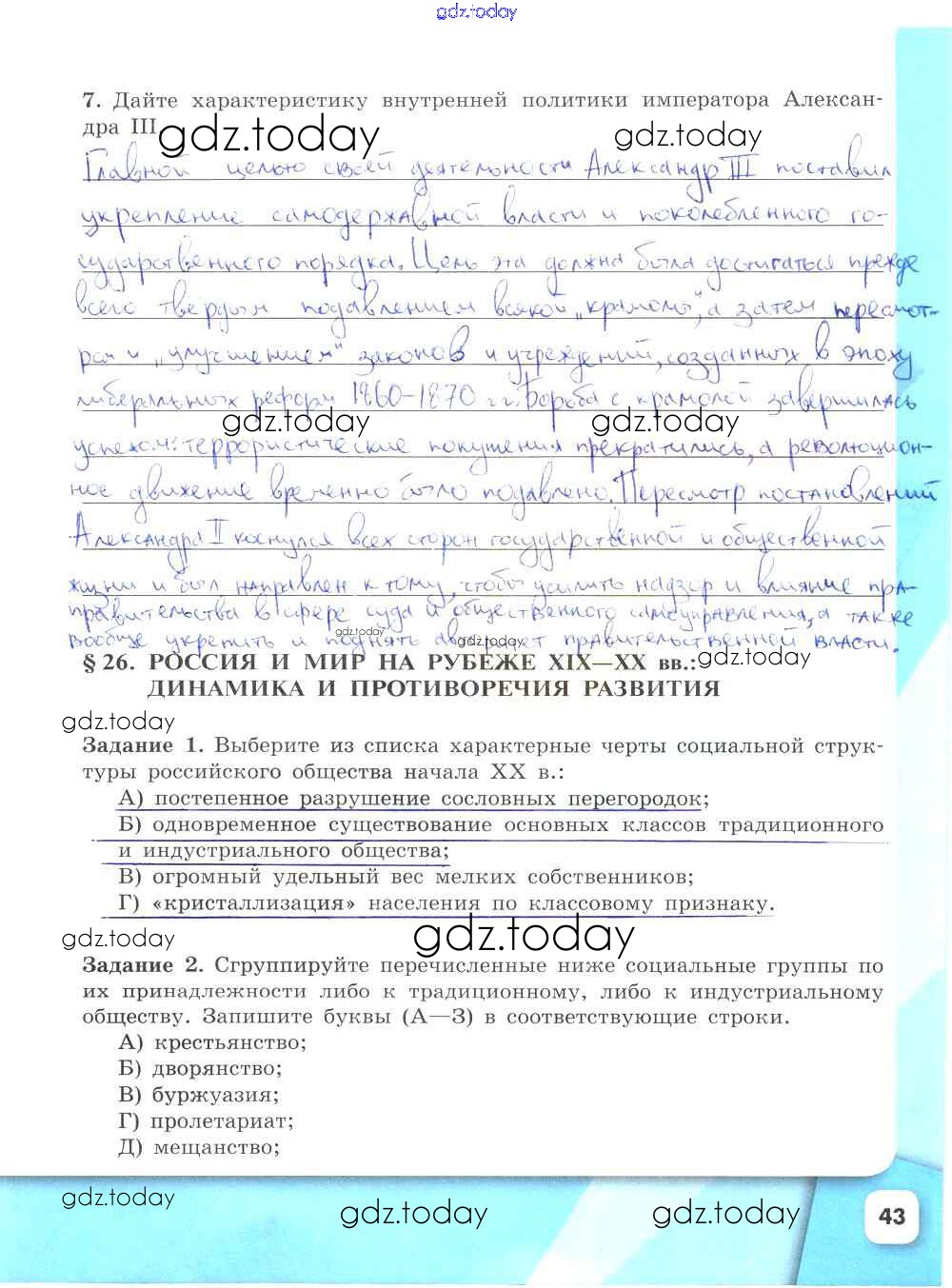 На страницах сайта gdz.today вы найдете учебный и вспомогательный материал, направленный на улучшения знаний школьной программы. ГДЗ - онлайн мир знаний Решение к части 2. Страницы 43 Рабочей тетради по Истории России для 9 класса Данилов, Косулина Просвещение УМК 2017