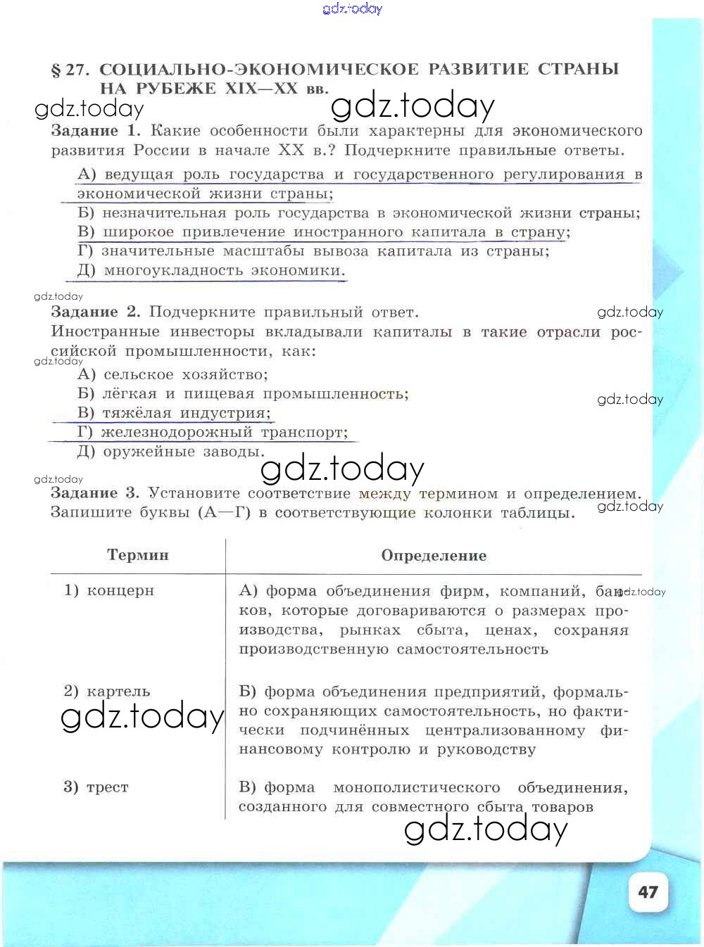 На страницах сайта gdz.today вы найдете учебный и вспомогательный материал, направленный на улучшения знаний школьной программы. ГДЗ - онлайн мир знаний Решение к части 2. Страницы 47 Рабочей тетради по Истории России для 9 класса Данилов, Косулина Просвещение УМК 2017