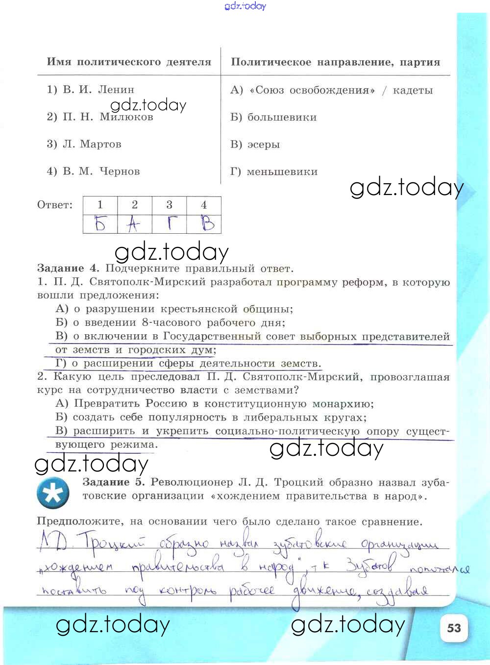 На страницах сайта gdz.today вы найдете учебный и вспомогательный материал, направленный на улучшения знаний школьной программы. ГДЗ - онлайн мир знаний Решение к части 2. Страницы 53 Рабочей тетради по Истории России для 9 класса Данилов, Косулина Просвещение УМК 2017