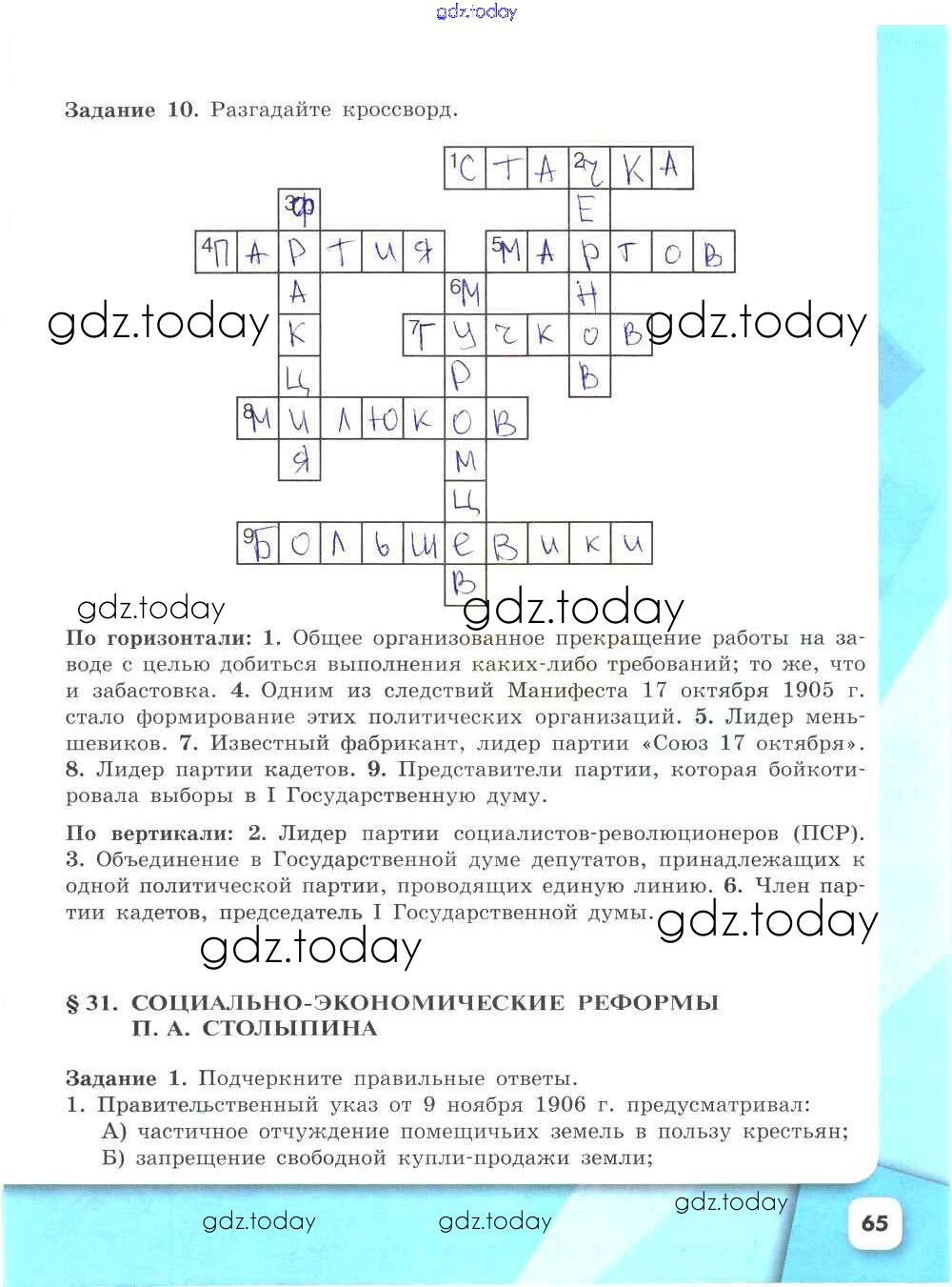 На страницах сайта gdz.today вы найдете учебный и вспомогательный материал, направленный на улучшения знаний школьной программы. ГДЗ - онлайн мир знаний Решение к части 2. Страницы 65 Рабочей тетради по Истории России для 9 класса Данилов, Косулина Просвещение УМК 2017