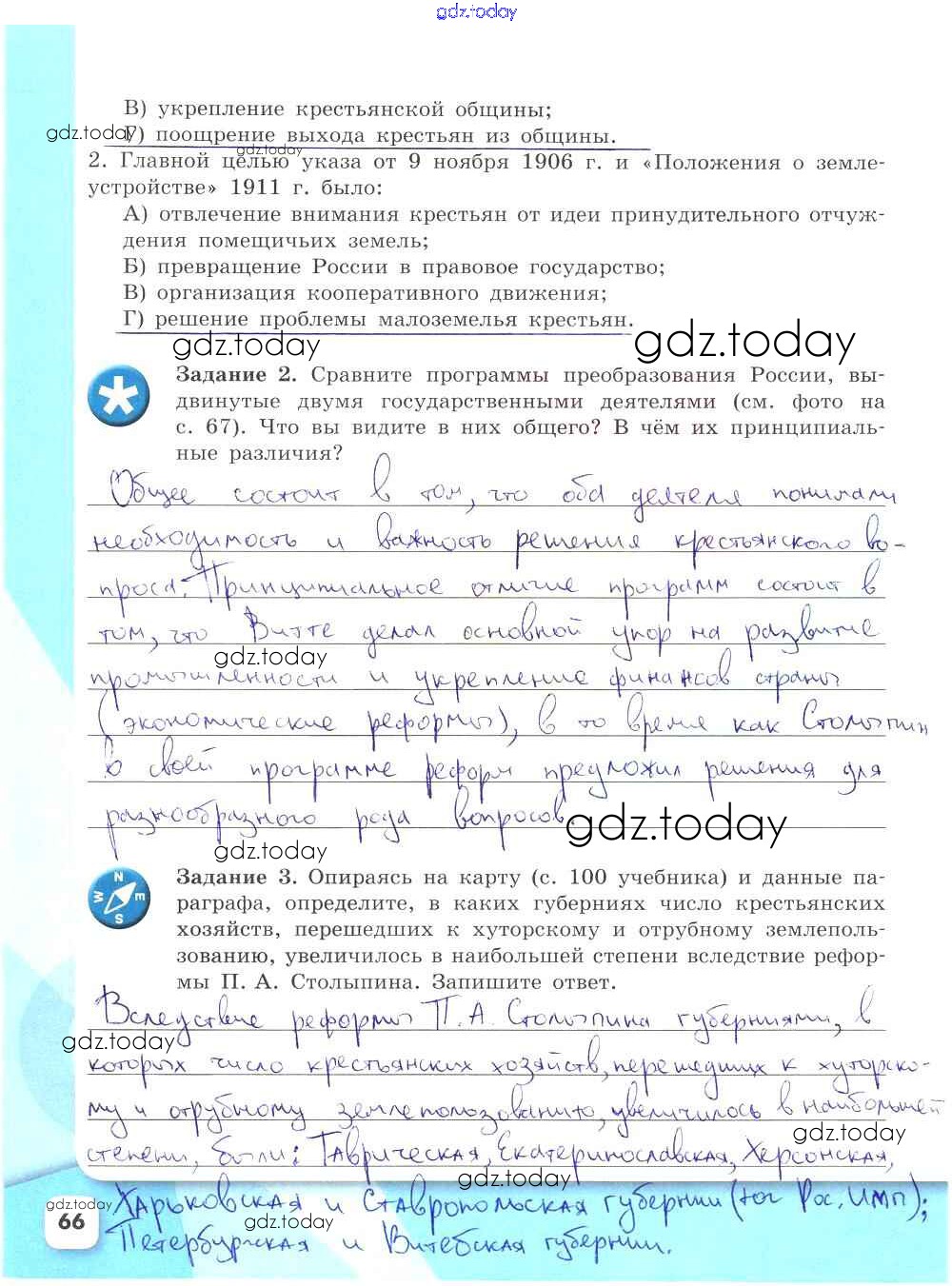 На страницах сайта gdz.today вы найдете учебный и вспомогательный материал, направленный на улучшения знаний школьной программы. ГДЗ - онлайн мир знаний Решение к части 2. Страницы 66 Рабочей тетради по Истории России для 9 класса Данилов, Косулина Просвещение УМК 2017