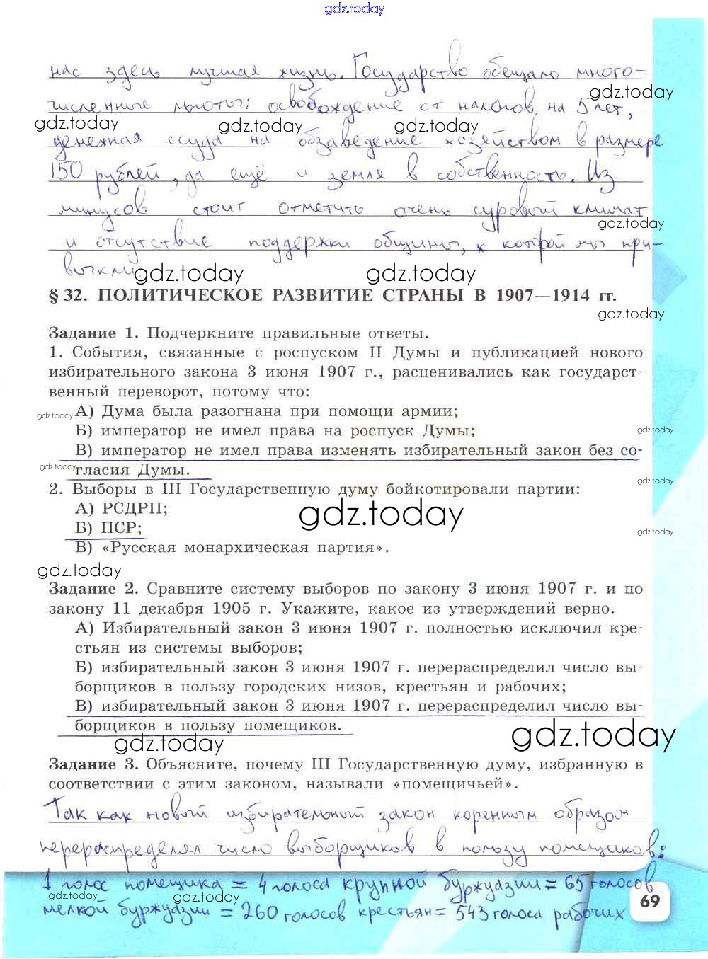 На страницах сайта gdz.today вы найдете учебный и вспомогательный материал, направленный на улучшения знаний школьной программы. ГДЗ - онлайн мир знаний Решение к части 2. Страницы 69 Рабочей тетради по Истории России для 9 класса Данилов, Косулина Просвещение УМК 2017