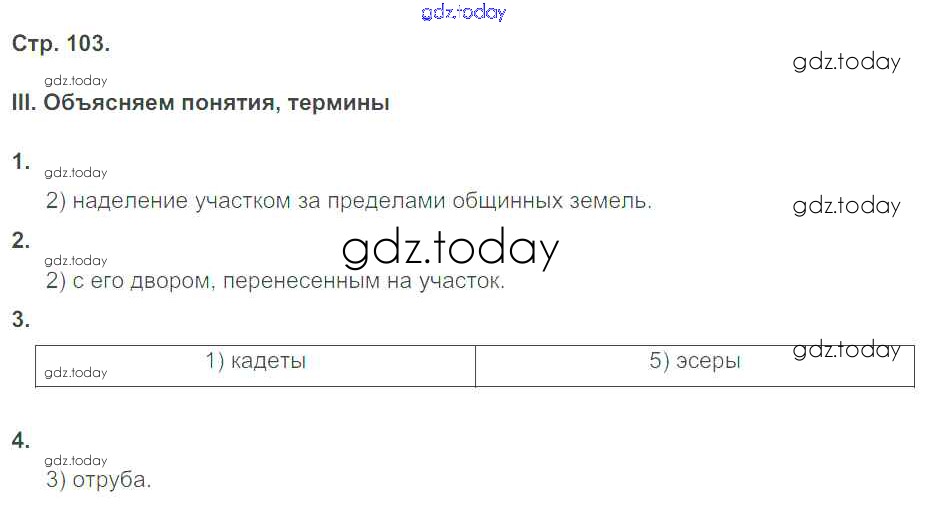На страницах сайта gdz.today вы найдете учебный и вспомогательный материал, направленный на улучшения знаний школьной программы. ГДЗ - онлайн мир знаний Страницы (решение) 103 Рабочей тетради по Истории России для 9 класса Гевуркова Экзамен УМК 2019