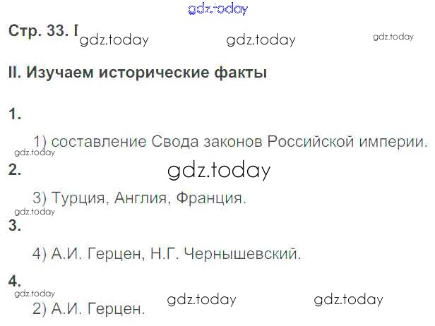 На страницах сайта gdz.today вы найдете учебный и вспомогательный материал, направленный на улучшения знаний школьной программы. ГДЗ - онлайн мир знаний Страницы (решение) 33 Рабочей тетради по Истории России для 9 класса Гевуркова Экзамен УМК 2019