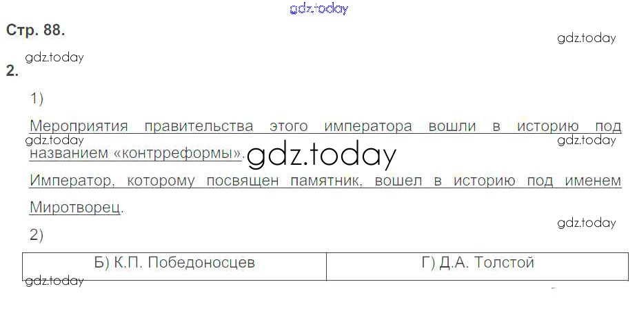 На страницах сайта gdz.today вы найдете учебный и вспомогательный материал, направленный на улучшения знаний школьной программы. ГДЗ - онлайн мир знаний Страницы (решение) 88 Рабочей тетради по Истории России для 9 класса Гевуркова Экзамен УМК 2019