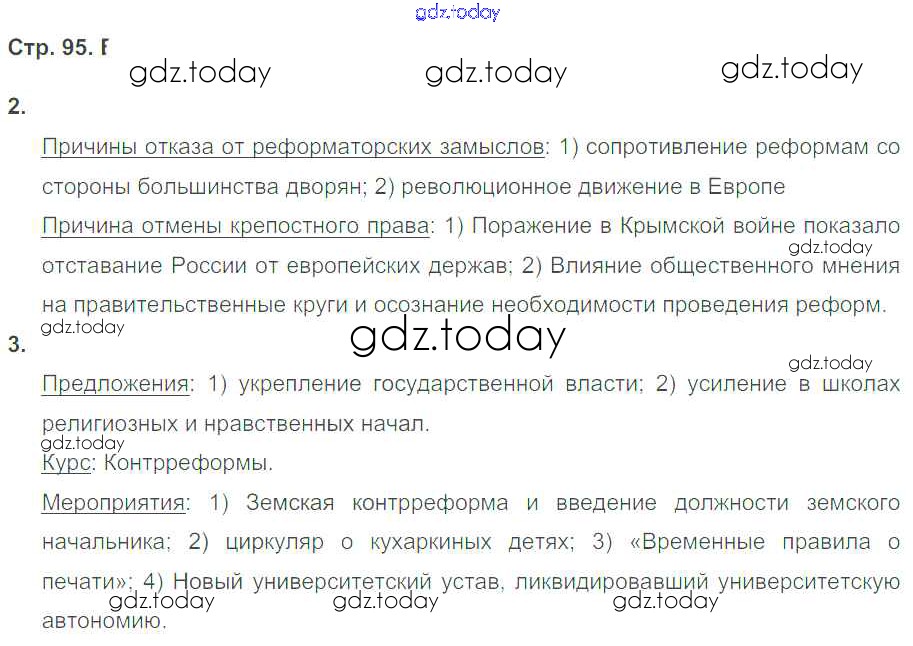 На страницах сайта gdz.today вы найдете учебный и вспомогательный материал, направленный на улучшения знаний школьной программы. ГДЗ - онлайн мир знаний Страницы (решение) 95 Рабочей тетради по Истории России для 9 класса Гевуркова Экзамен УМК 2019