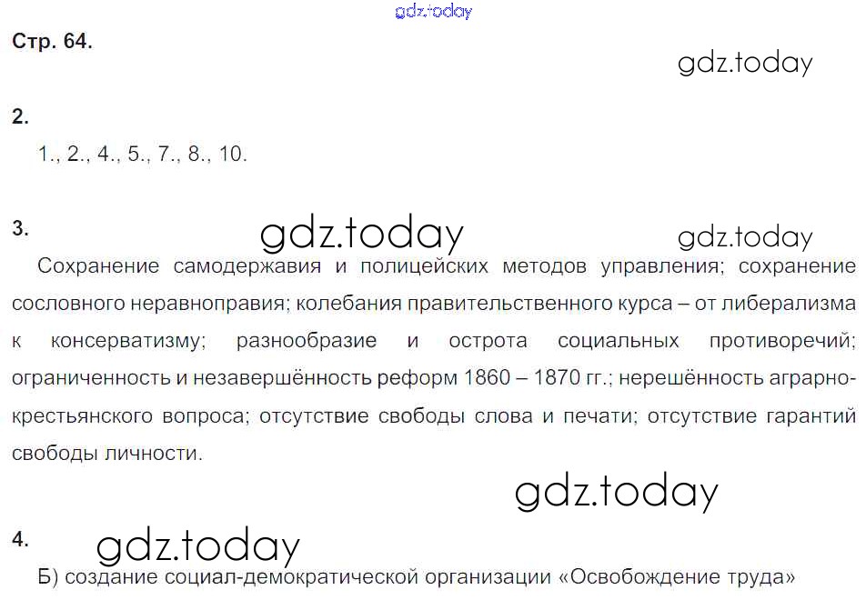На страницах сайта gdz.today вы найдете учебный и вспомогательный материал, направленный на улучшения знаний школьной программы. ГДЗ - онлайн мир знаний Страницы (решение) 64 Рабочей тетради по Истории России для 9 класса Симонова, Клоков Дрофа Вертикаль 2017
