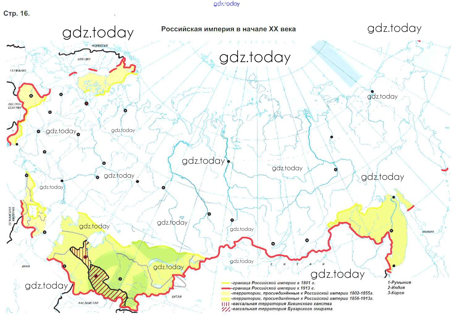 На страницах сайта gdz.today вы найдете учебный и вспомогательный материал, направленный на улучшения знаний школьной программы. ГДЗ - онлайн мир знаний Страницы (решение) 16 Контурным картам по Истории России для 9 класса Приваловский, Волкова Дрофа 2016