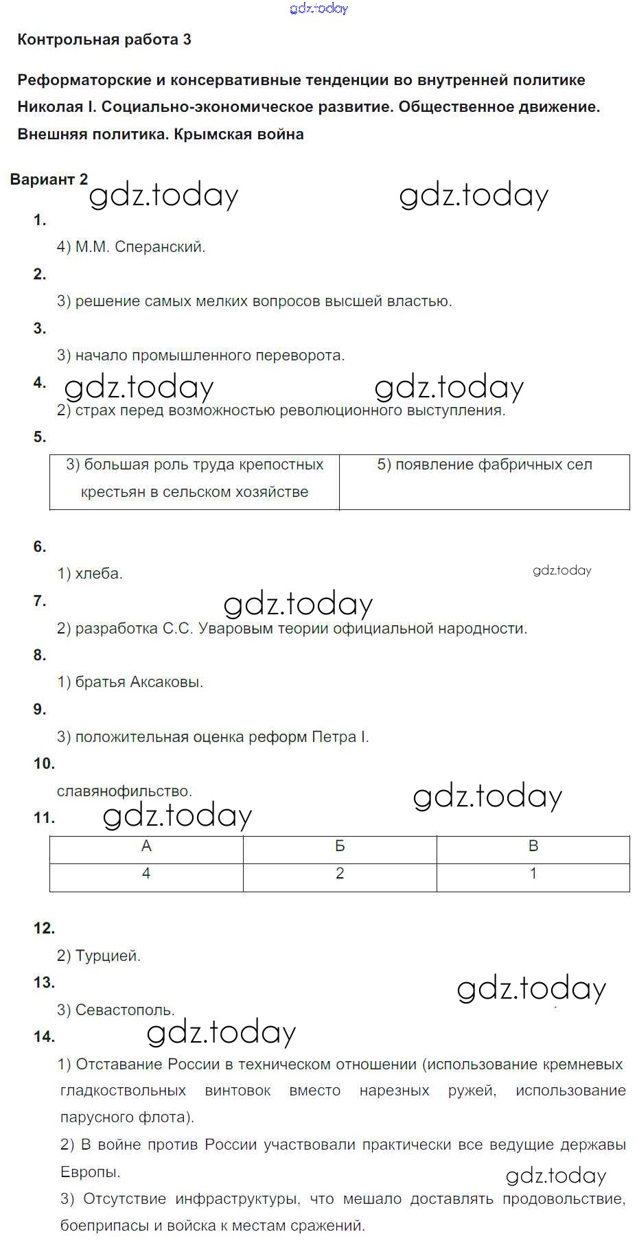 На страницах сайта gdz.today вы найдете учебный и вспомогательный материал, направленный на улучшения знаний школьной программы. ГДЗ - онлайн мир знаний Решение к контрольной работе 3. Варианты 2 Контрольным работам по Истории России для 9 класса Соловьев Экзамен УМК 2020