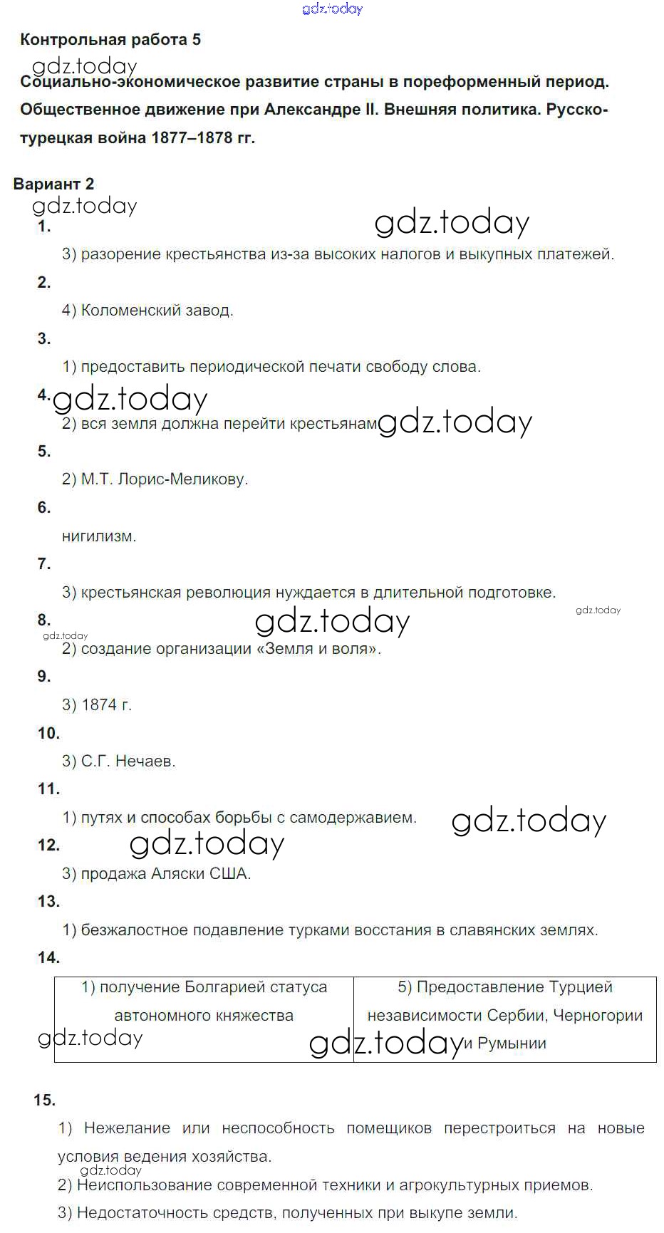 На страницах сайта gdz.today вы найдете учебный и вспомогательный материал, направленный на улучшения знаний школьной программы. ГДЗ - онлайн мир знаний Решение к контрольной работе 5. Варианты 2 Контрольным работам по Истории России для 9 класса Соловьев Экзамен УМК 2020