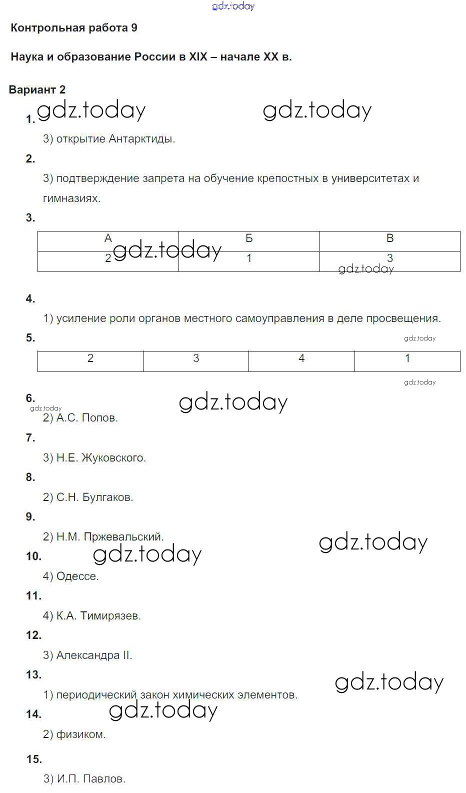 На страницах сайта gdz.today вы найдете учебный и вспомогательный материал, направленный на улучшения знаний школьной программы. ГДЗ - онлайн мир знаний Решение к контрольной работе 9. Варианты 2 Контрольным работам по Истории России для 9 класса Соловьев Экзамен УМК 2020