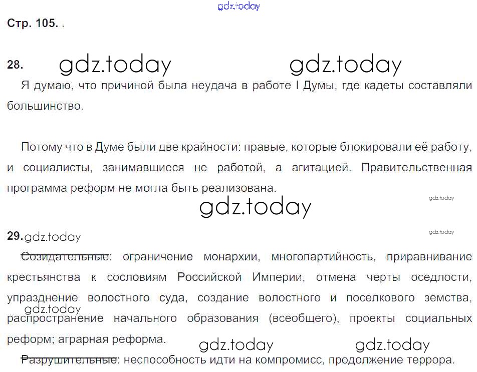 На страницах сайта gdz.today вы найдете учебный и вспомогательный материал, направленный на улучшения знаний школьной программы. ГДЗ - онлайн мир знаний Страницы (решение) 105 Рабочей тетради по Истории России для 9 класса Стаферова, Шевырев Русское слово Инновационная школа 2019