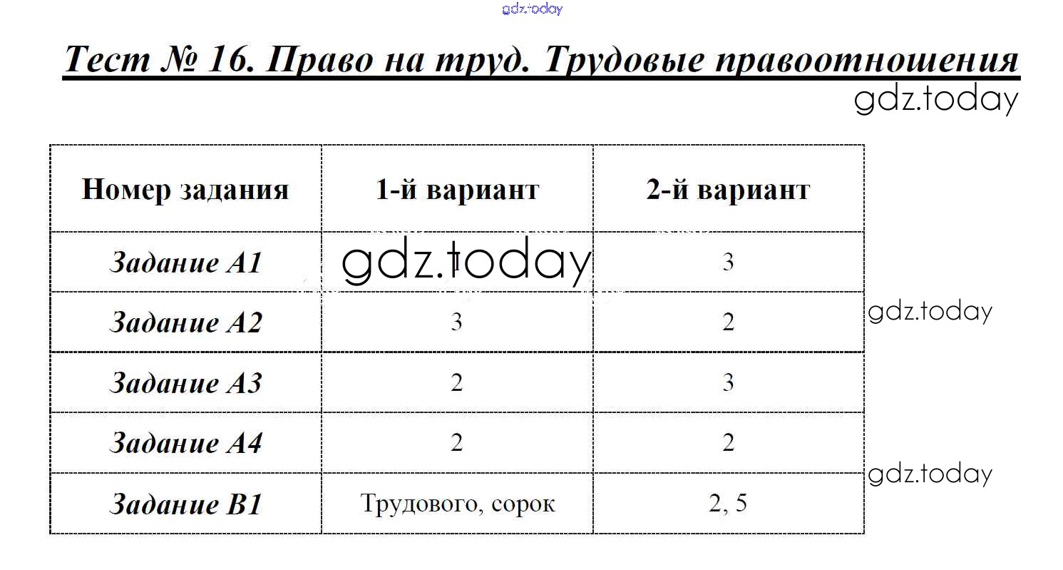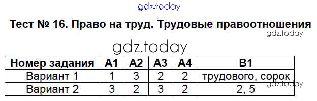 На страницах сайта gdz.today вы найдете учебный и вспомогательный материал, направленный на улучшения знаний школьной программы. ГДЗ - онлайн мир знаний Решение к тестам Тест 16. Право на труд. Трудовые правоотношения Контрольно-измерительным материалам (КИМ) по Обществознанию для 9 класса Поздеев ВАКО 2018