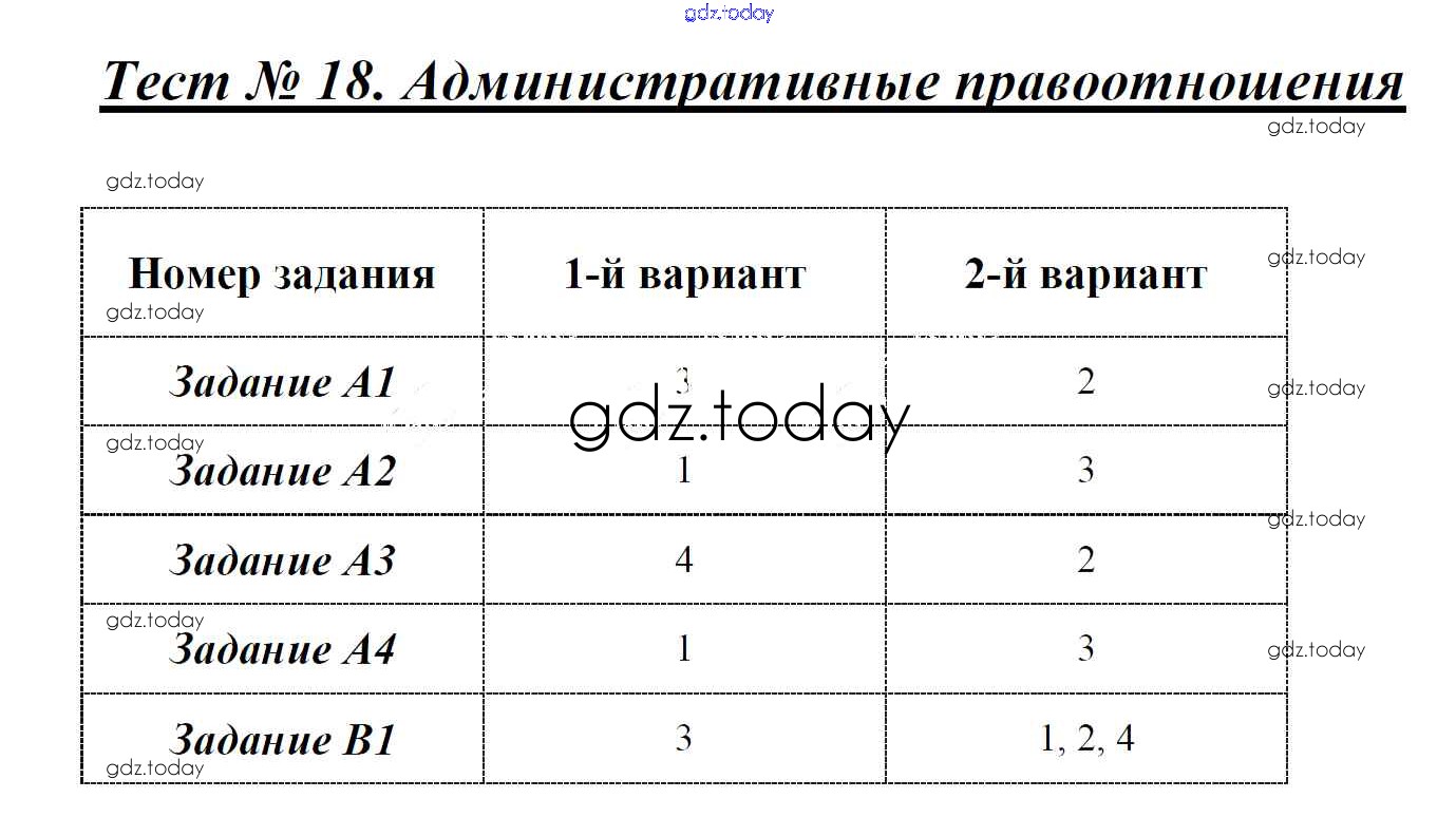 На страницах сайта gdz.today вы найдете учебный и вспомогательный материал, направленный на улучшения знаний школьной программы. ГДЗ - онлайн мир знаний Решение к тестам Тест 18. Административные правоотношения Контрольно-измерительным материалам (КИМ) по Обществознанию для 9 класса Поздеев ВАКО 2018