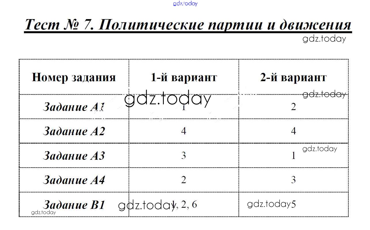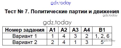 На страницах сайта gdz.today вы найдете учебный и вспомогательный материал, направленный на улучшения знаний школьной программы. ГДЗ - онлайн мир знаний Решение к тестам Тест 7. Политические партии и движения Контрольно-измерительным материалам (КИМ) по Обществознанию для 9 класса Поздеев ВАКО 2018