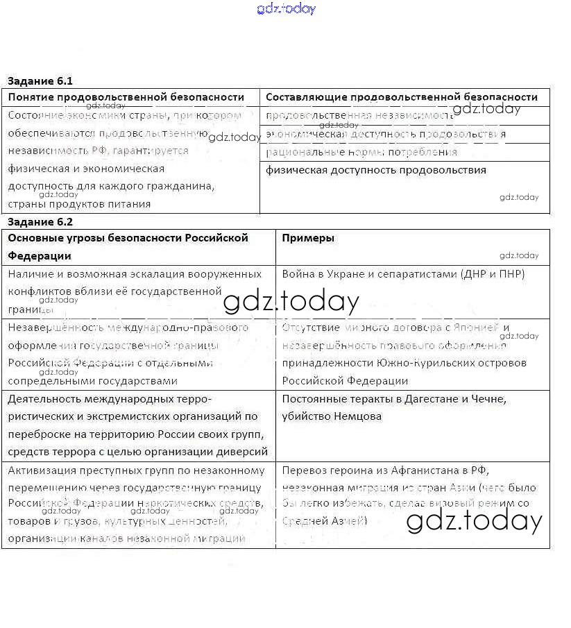 Ответы к Решение к главе 1. Национальная безопасность России в современном мире 6 Рабочей тетради по ОБЖ для 9 класса Подолян Дрофа 2018