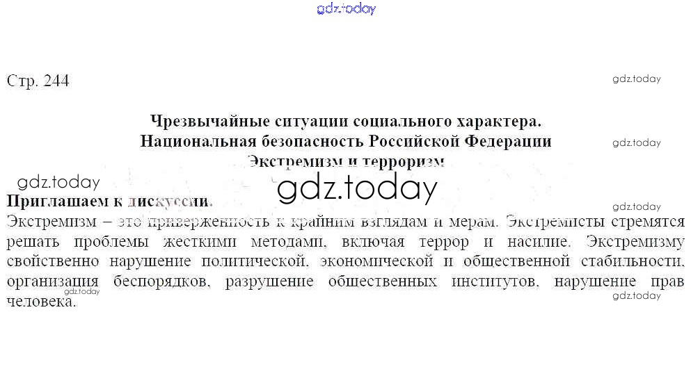 На страницах сайта gdz.today вы найдете учебный и вспомогательный материал, направленный на улучшения знаний школьной программы. ГДЗ - онлайн мир знаний Страницы (решение) 244 Учебнику по ОБЖ для 7-9 класса Виноградова, Таранин Вентана-граф Алгоритм успеха 2019