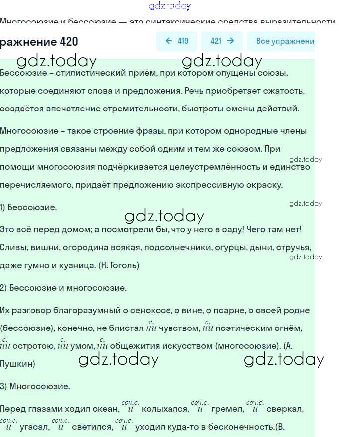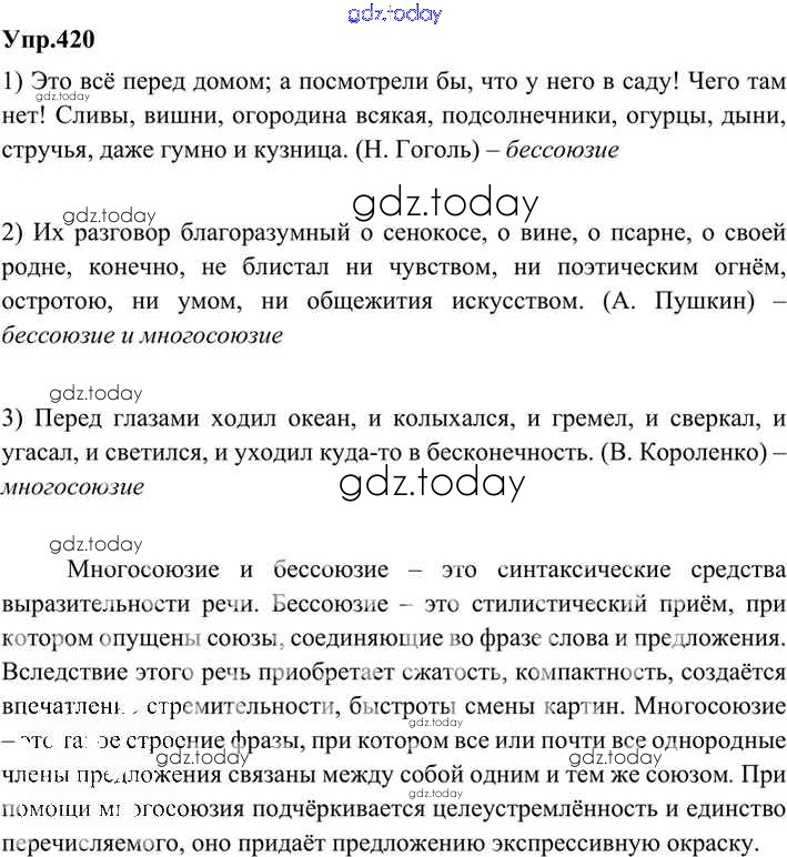 На страницах сайта gdz.today вы найдете учебный и вспомогательный материал, направленный на улучшения знаний школьной программы. ГДЗ - онлайн мир знаний Решение. Упражнения 420 Учебнику по Русскому языку для 9 класса Бархударов, Крючков Просвещение, Просвещение 2011, 2019