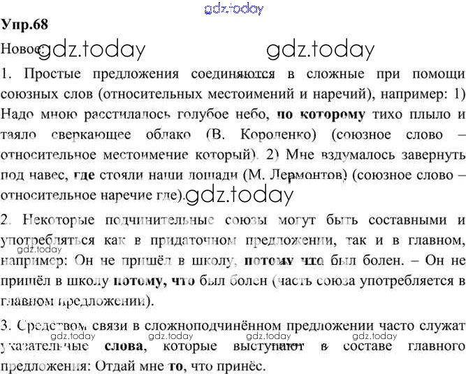 На страницах сайта gdz.today вы найдете учебный и вспомогательный материал, направленный на улучшения знаний школьной программы. ГДЗ - онлайн мир знаний Решение. Упражнения 68 Учебнику по Русскому языку для 9 класса Бархударов, Крючков Просвещение, Просвещение 2011, 2019