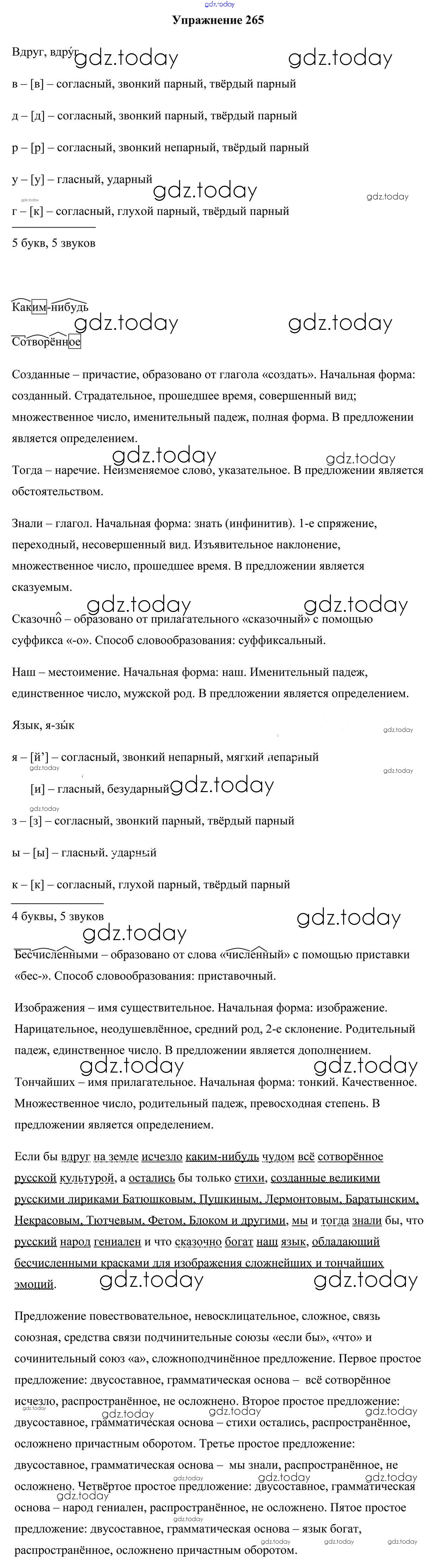 На страницах сайта gdz.today вы найдете учебный и вспомогательный материал, направленный на улучшения знаний школьной программы. ГДЗ - онлайн мир знаний Решение к упражнениям 265 Учебнику по Русскому языку для 9 класса Мурина, Литвинко Национальный институт образования 2011