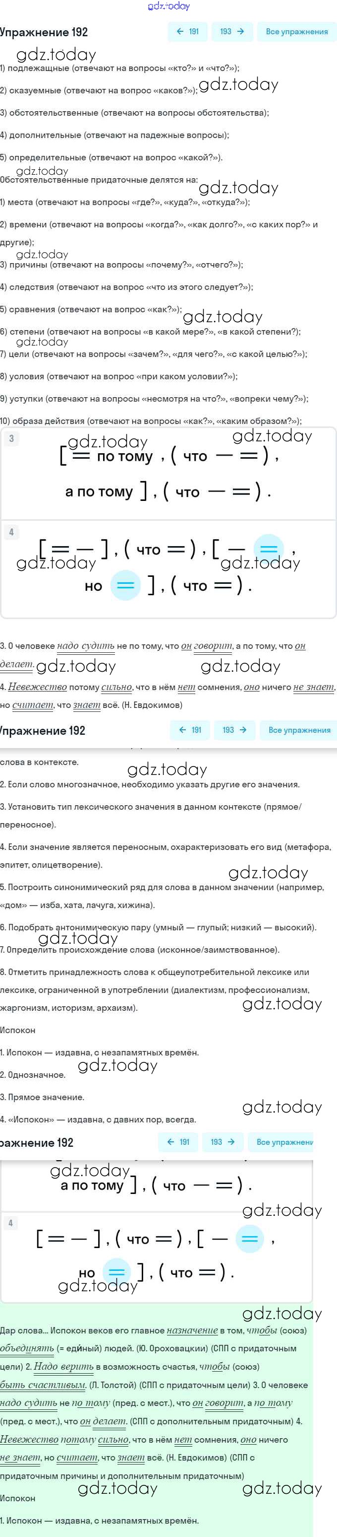 На страницах сайта gdz.today вы найдете учебный и вспомогательный материал, направленный на улучшения знаний школьной программы. ГДЗ - онлайн мир знаний Решение. Упражнения 192 Практике по Русскому языку для 9 класса Пичугов, Еремеева Просвещение, Дрофа 2022, 2012