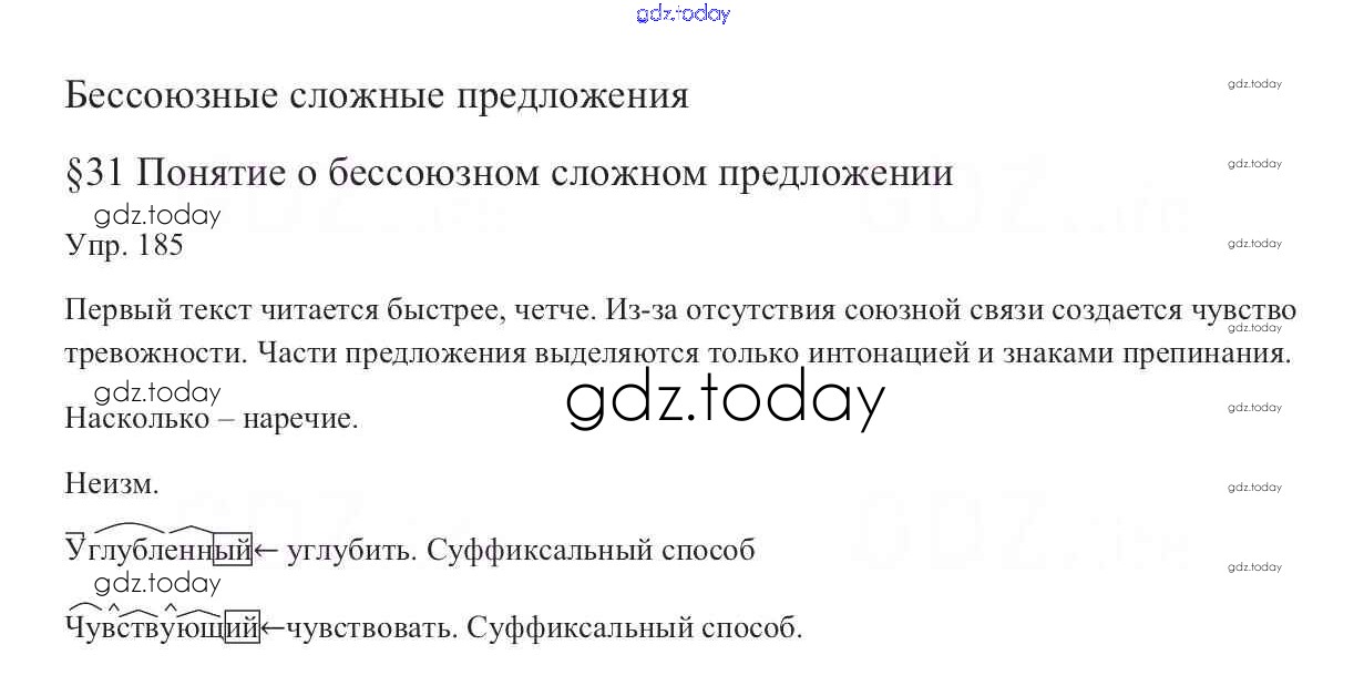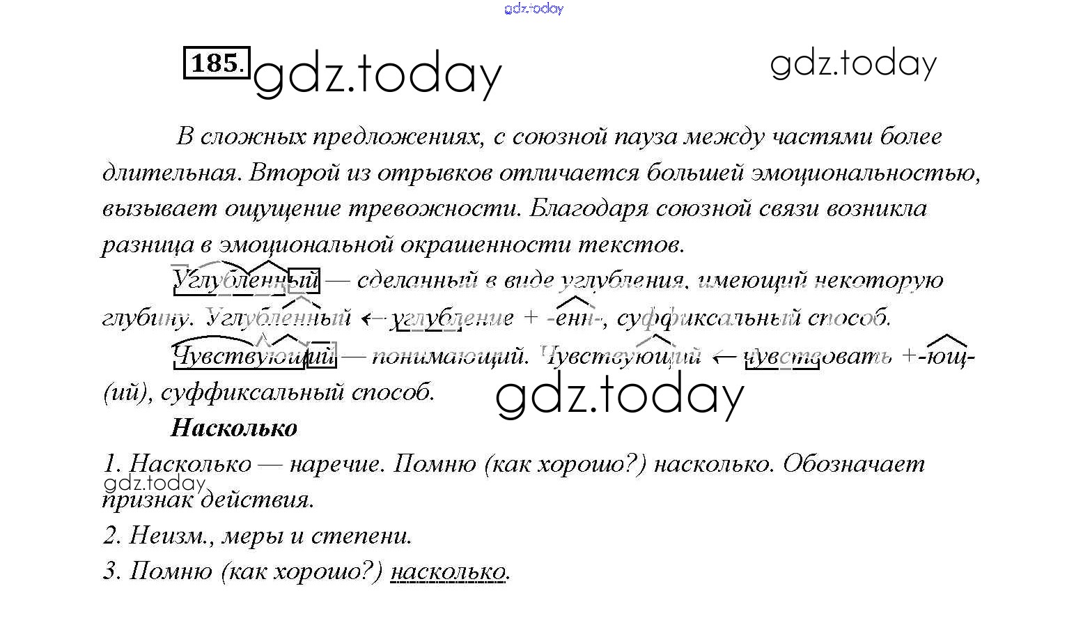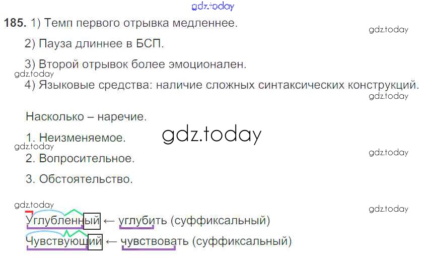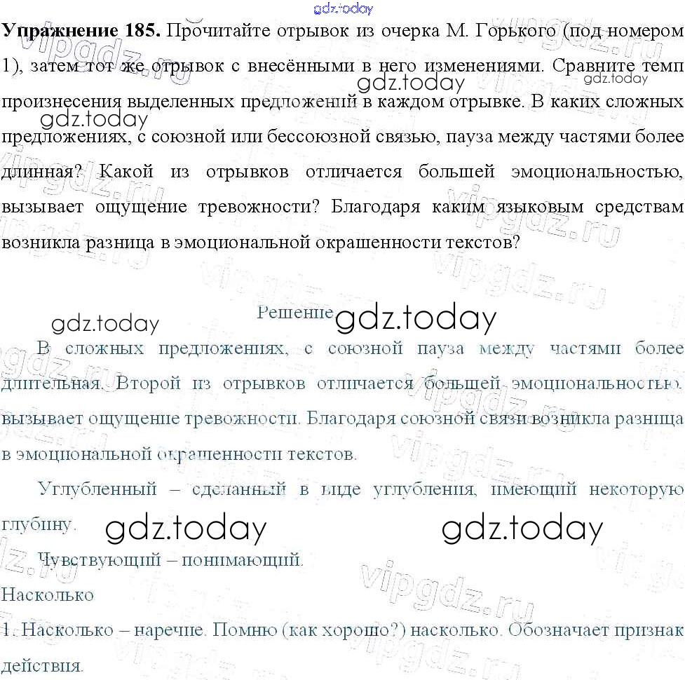 На страницах сайта gdz.today вы найдете учебный и вспомогательный материал, направленный на улучшения знаний школьной программы. ГДЗ - онлайн мир знаний Решение к упражнениям 185 Учебнику по Русскому языку для 9 класса Тростенцова, Ладыженская Просвещение 2014