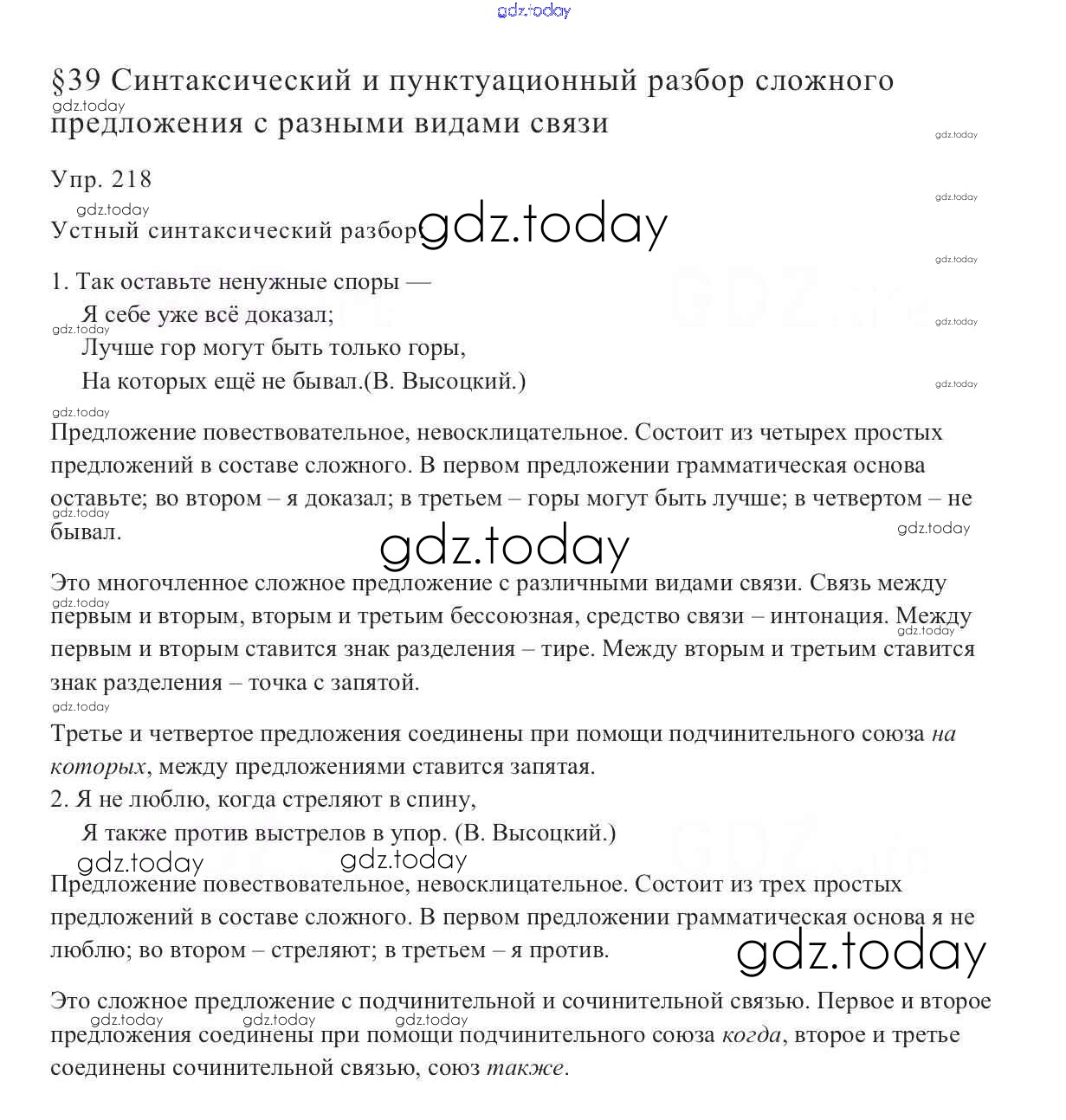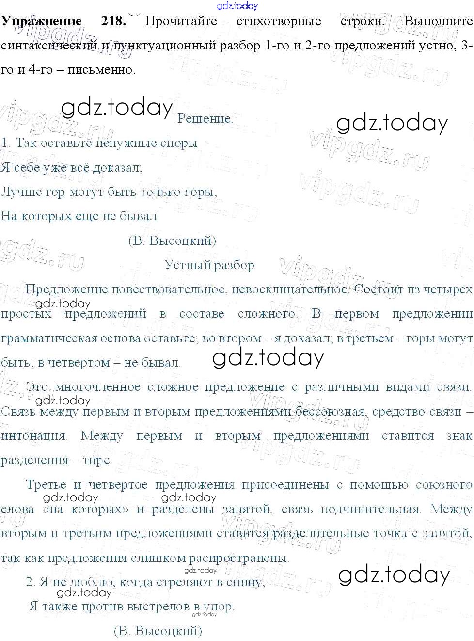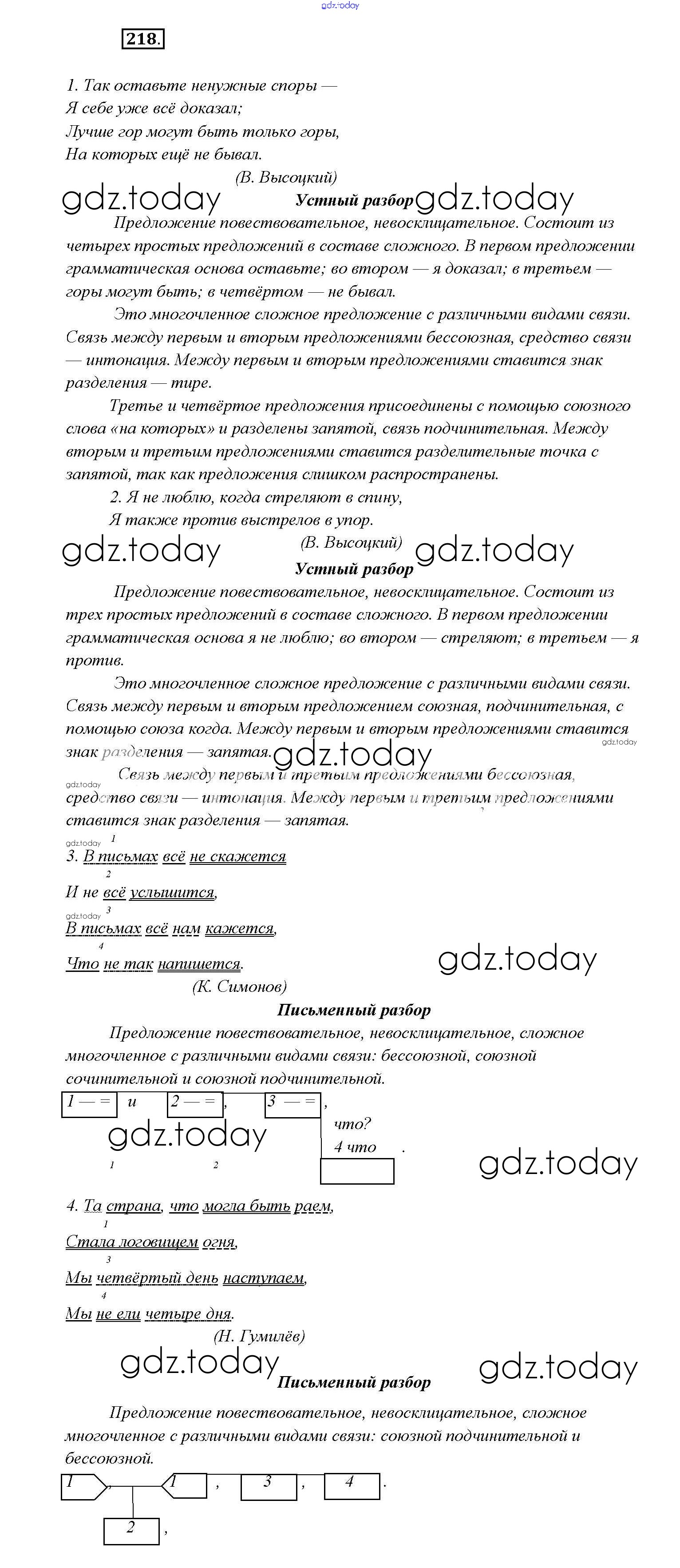 На страницах сайта gdz.today вы найдете учебный и вспомогательный материал, направленный на улучшения знаний школьной программы. ГДЗ - онлайн мир знаний Решение к упражнениям 218 Учебнику по Русскому языку для 9 класса Тростенцова, Ладыженская Просвещение 2014