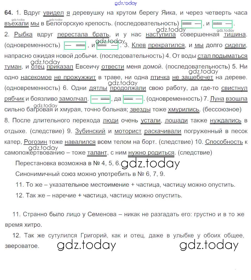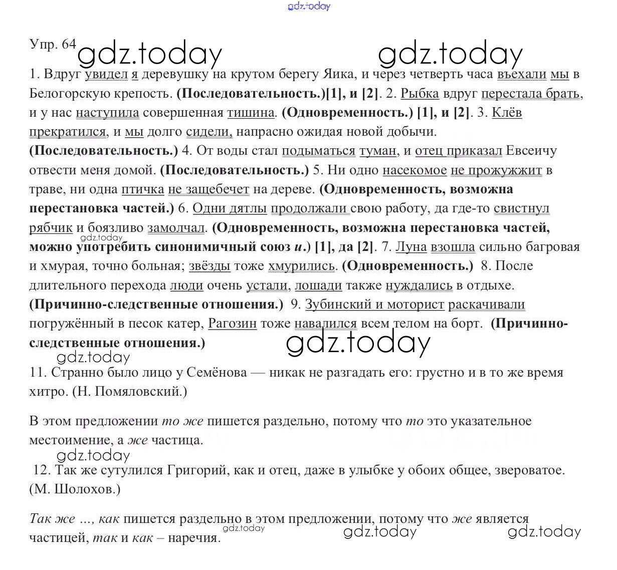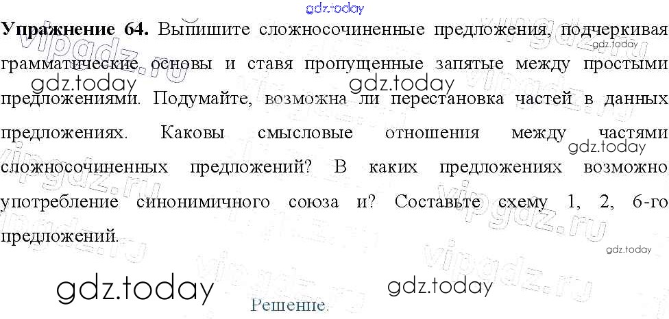 Ответы к Решение к упражнениям 64 Учебнику по Русскому языку для 9 класса Тростенцова, Ладыженская Просвещение 2014