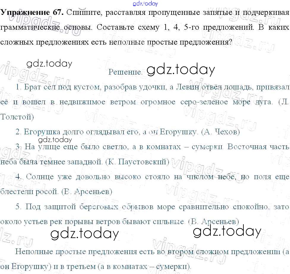Ответы к Решение к упражнениям 67 Учебнику по Русскому языку для 9 класса Тростенцова, Ладыженская Просвещение 2014