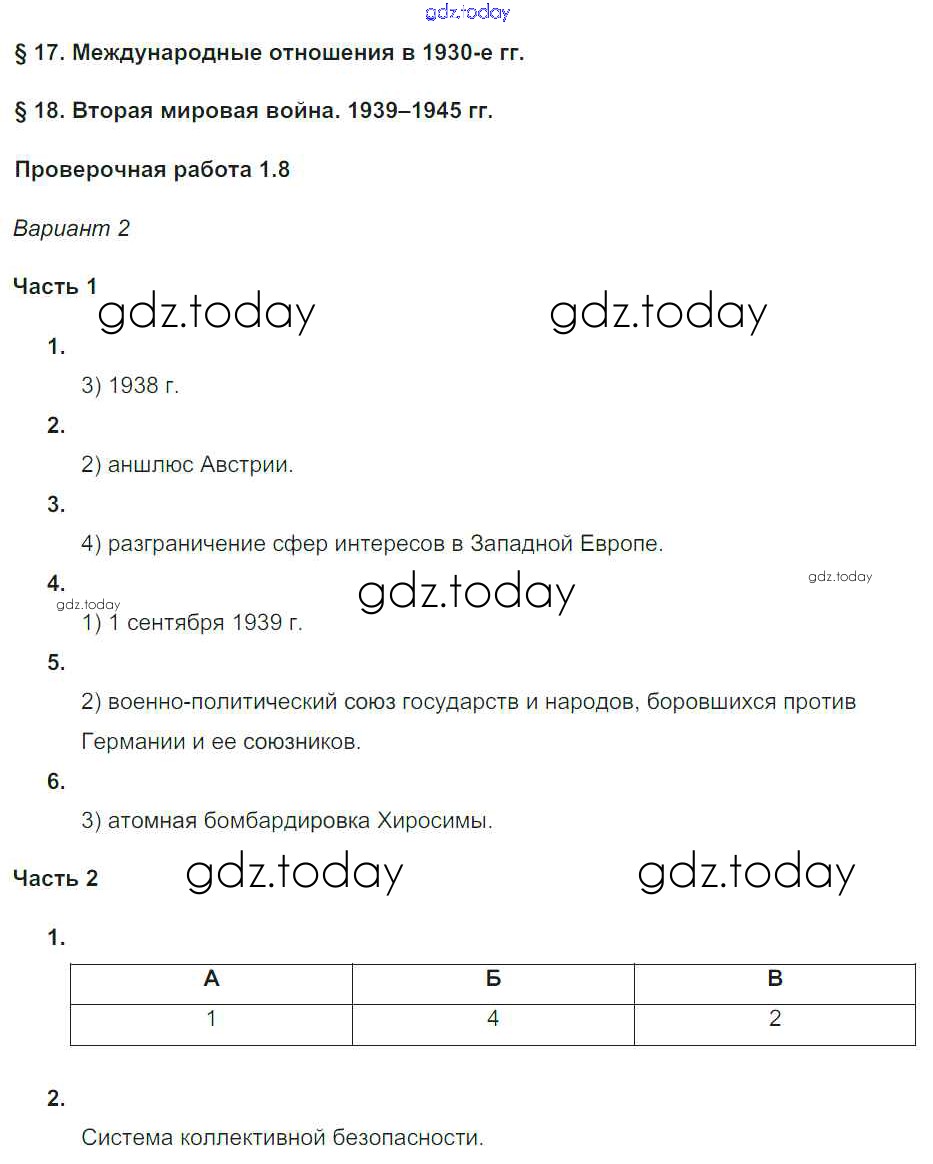На страницах сайта gdz.today вы найдете учебный и вспомогательный материал, направленный на улучшения знаний школьной программы. ГДЗ - онлайн мир знаний Параграфы 17-18 Решение к проверочным работам 2 Проверочным и контрольным работам по Всеобщей истории для 9 класса Баранов Просвещение 2015