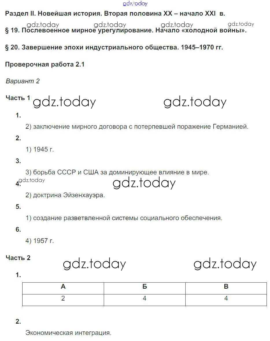 На страницах сайта gdz.today вы найдете учебный и вспомогательный материал, направленный на улучшения знаний школьной программы. ГДЗ - онлайн мир знаний Параграфы 19-20 Решение к проверочным работам 2 Проверочным и контрольным работам по Всеобщей истории для 9 класса Баранов Просвещение 2015