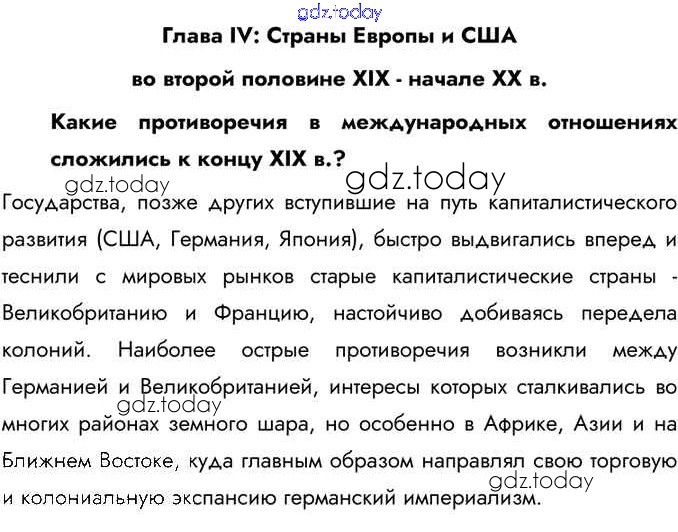 На страницах сайта gdz.today вы найдете учебный и вспомогательный материал, направленный на улучшения знаний школьной программы. ГДЗ - онлайн мир знаний Решение к главе 4 Страны Европы и США во второй половине XIX - начале XX в. Учебнику по Всеобщей истории для 9 класса Юдовская, Баранов Просвещение 2019