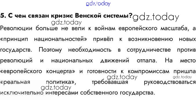 На страницах сайта gdz.today вы найдете учебный и вспомогательный материал, направленный на улучшения знаний школьной программы. ГДЗ - онлайн мир знаний Вопросы §24 5 Учебнику по Всеобщей истории для 9 класса Юдовская, Баранов Просвещение 2019